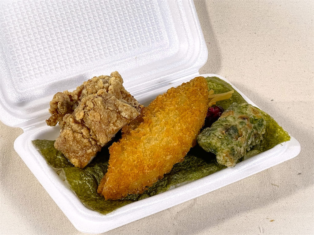 白身フライとちくわの磯部揚げに醤油からあげハーフ2個がはいった海苔弁当ごはんは並盛200g